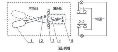 控制器由浮筒組與觸頭組二大部分組成。當被測液位升高或降低時,浮筒(1)隨之升降,使用其端部的磁鋼(2)上下擺動,通過磁力排斥安裝在外殼(3)內相同磁極的磁鋼(4)上下擺動。其另一端的觸頭(5)便在靜觸壯舉1—1,及2—2間連通或斷開,隨即在電路中的信號裝置發出光或聲的信號,或啟閉電動泵供液或收液。 |